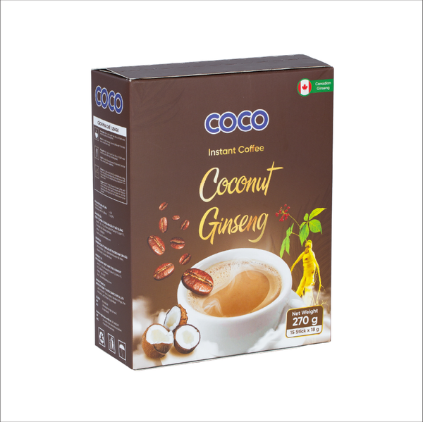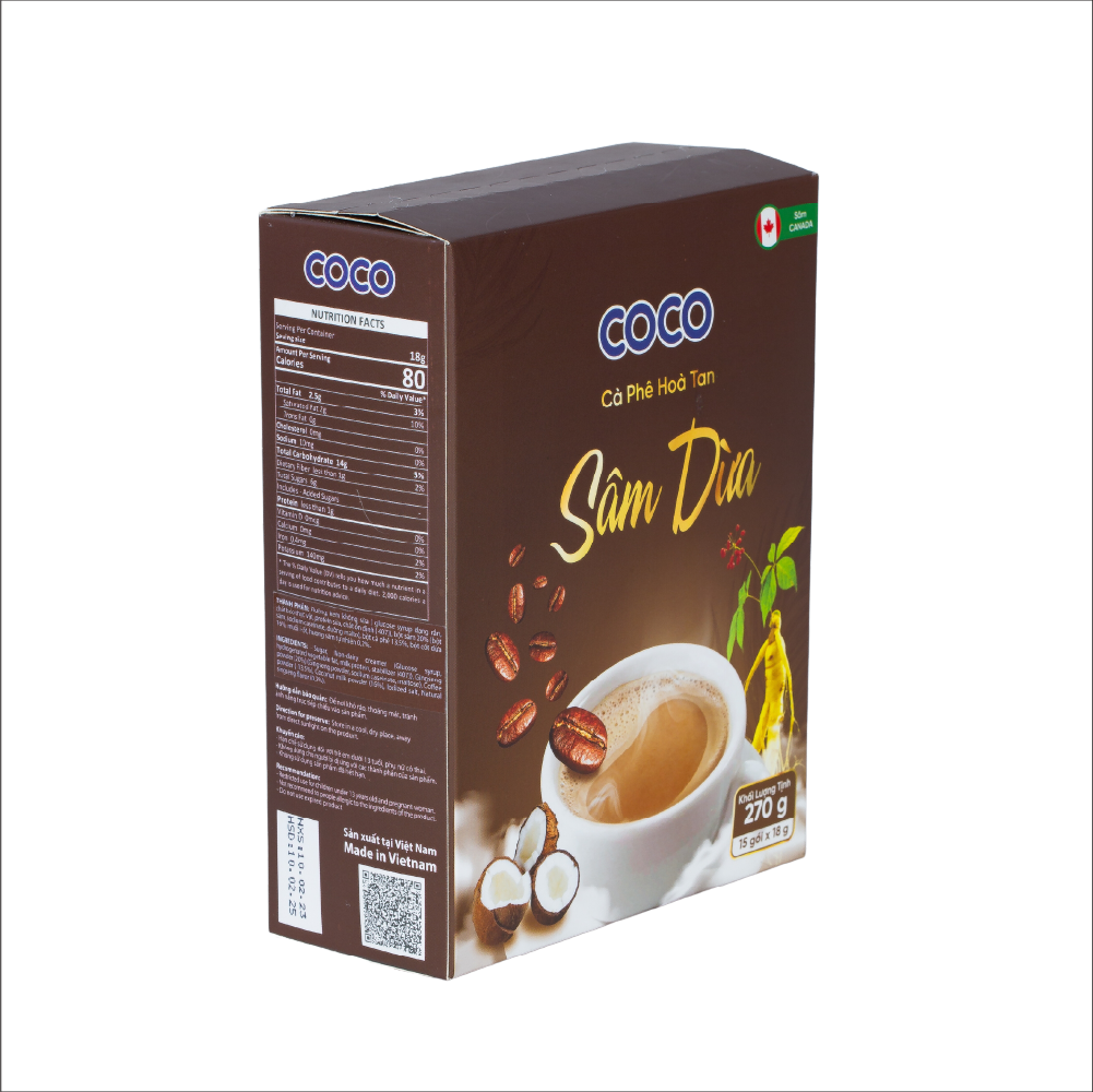 Thành Phần: Tinh cà phê chiết xuất, bột nhân sâm Canada 5 năm tuổi, Sữa dừa,kem sữa, đường.